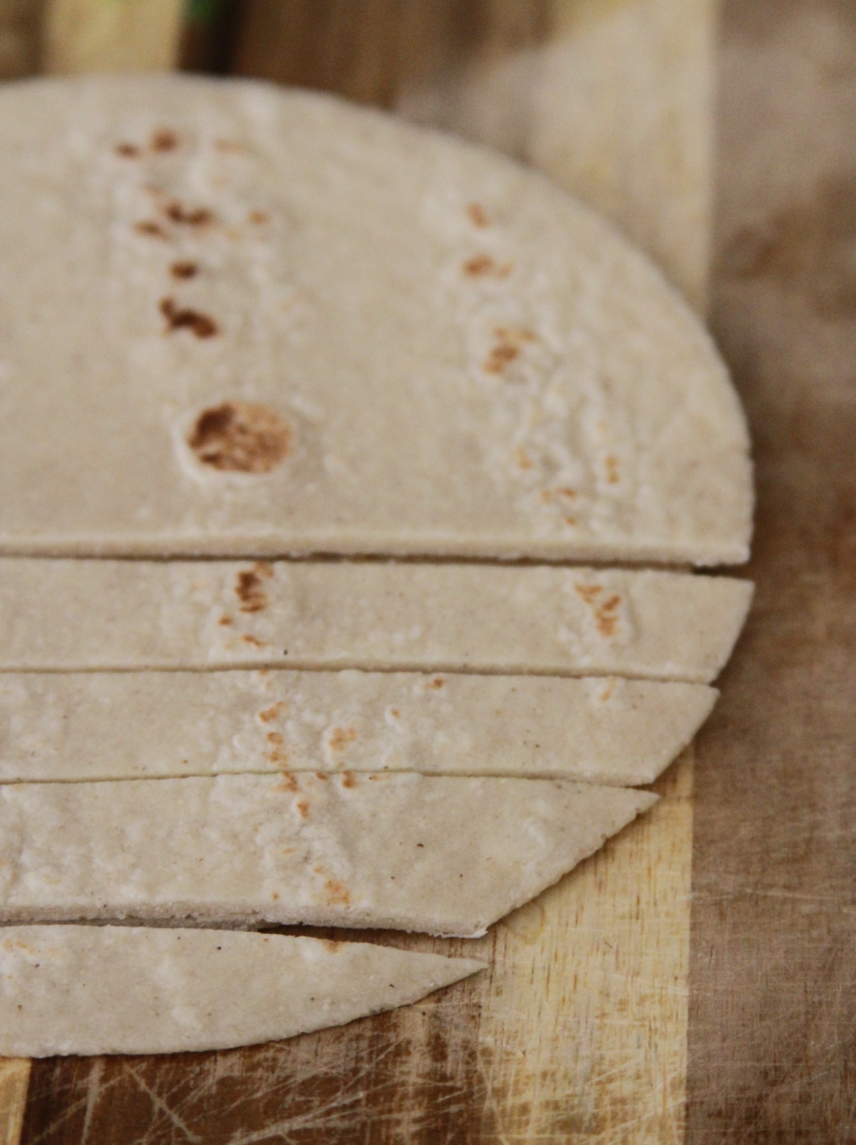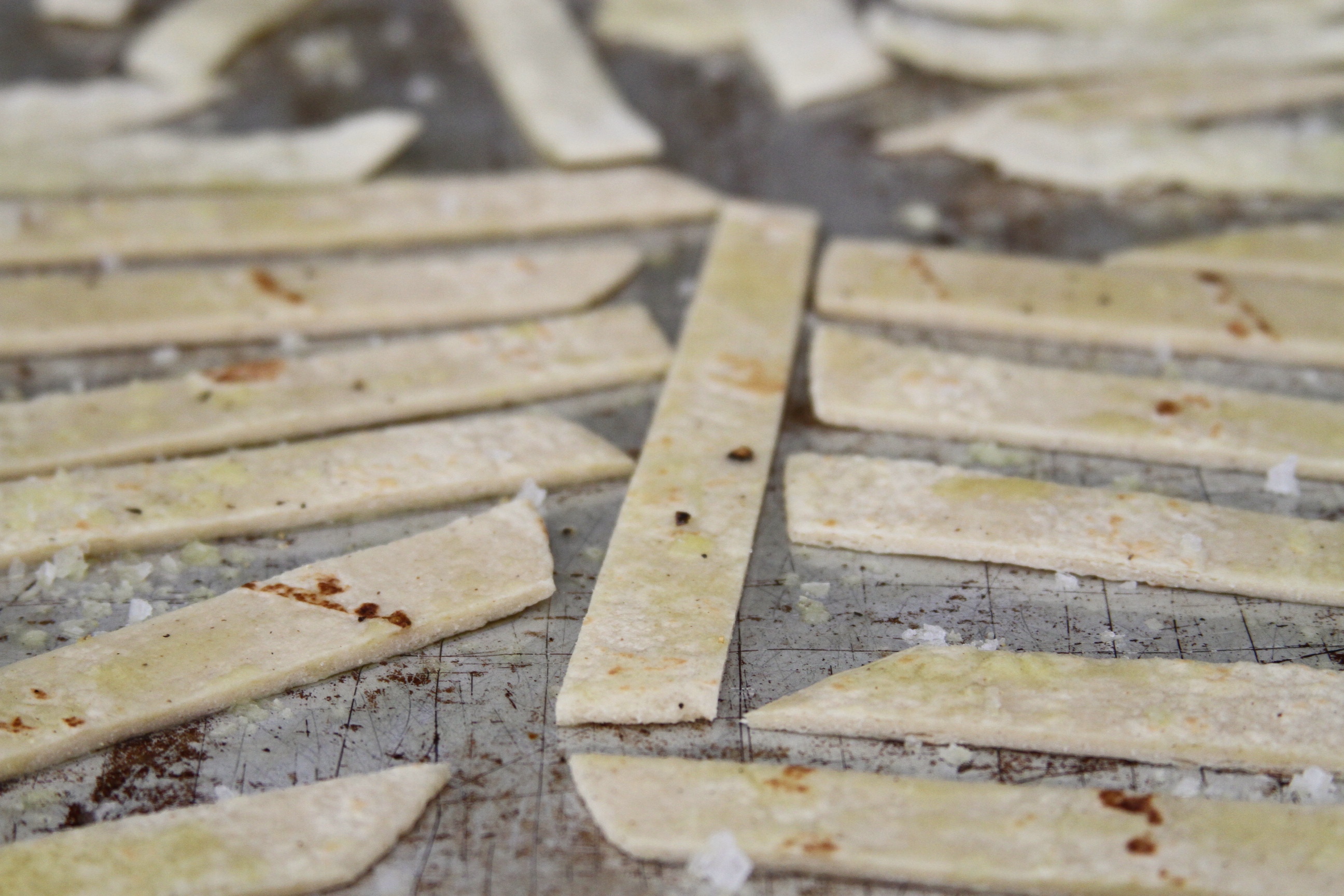 - Cut tortillas into 1/2 inch wide strips and arrange on oiled baking sheet. brush with remaining oil and sprinkle with salt.