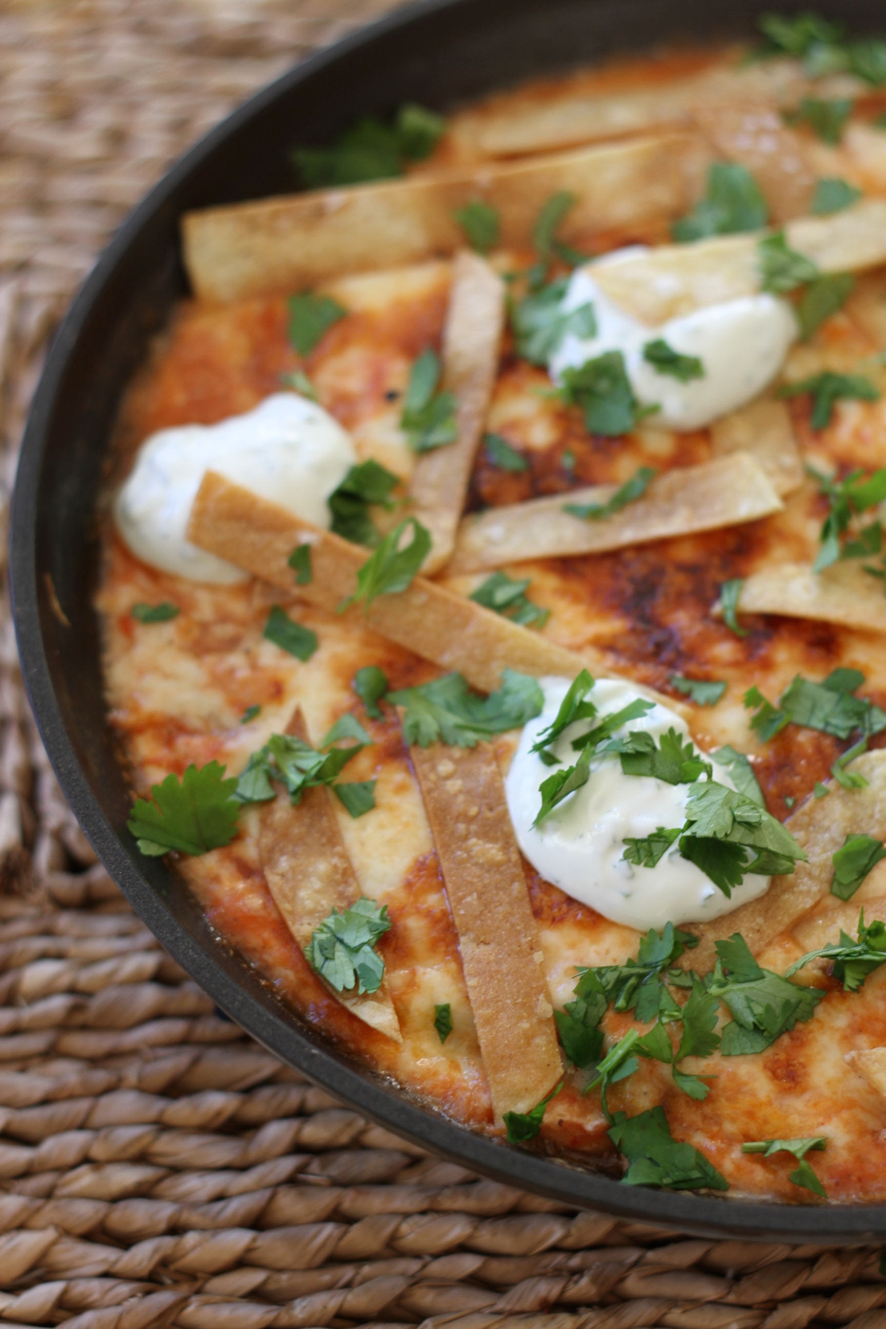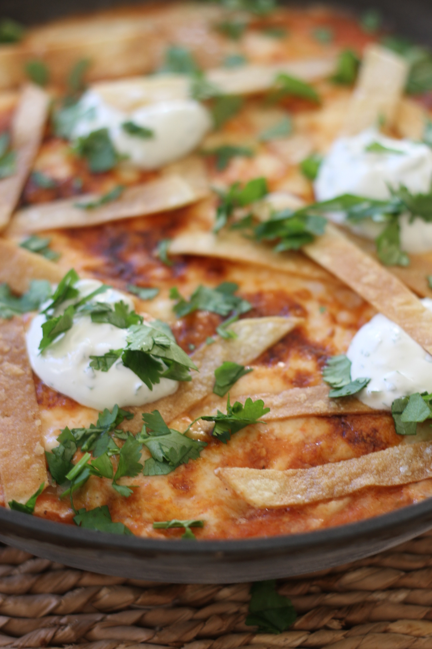 - Serve with dollops of crema, tortilla strips and cilantro.