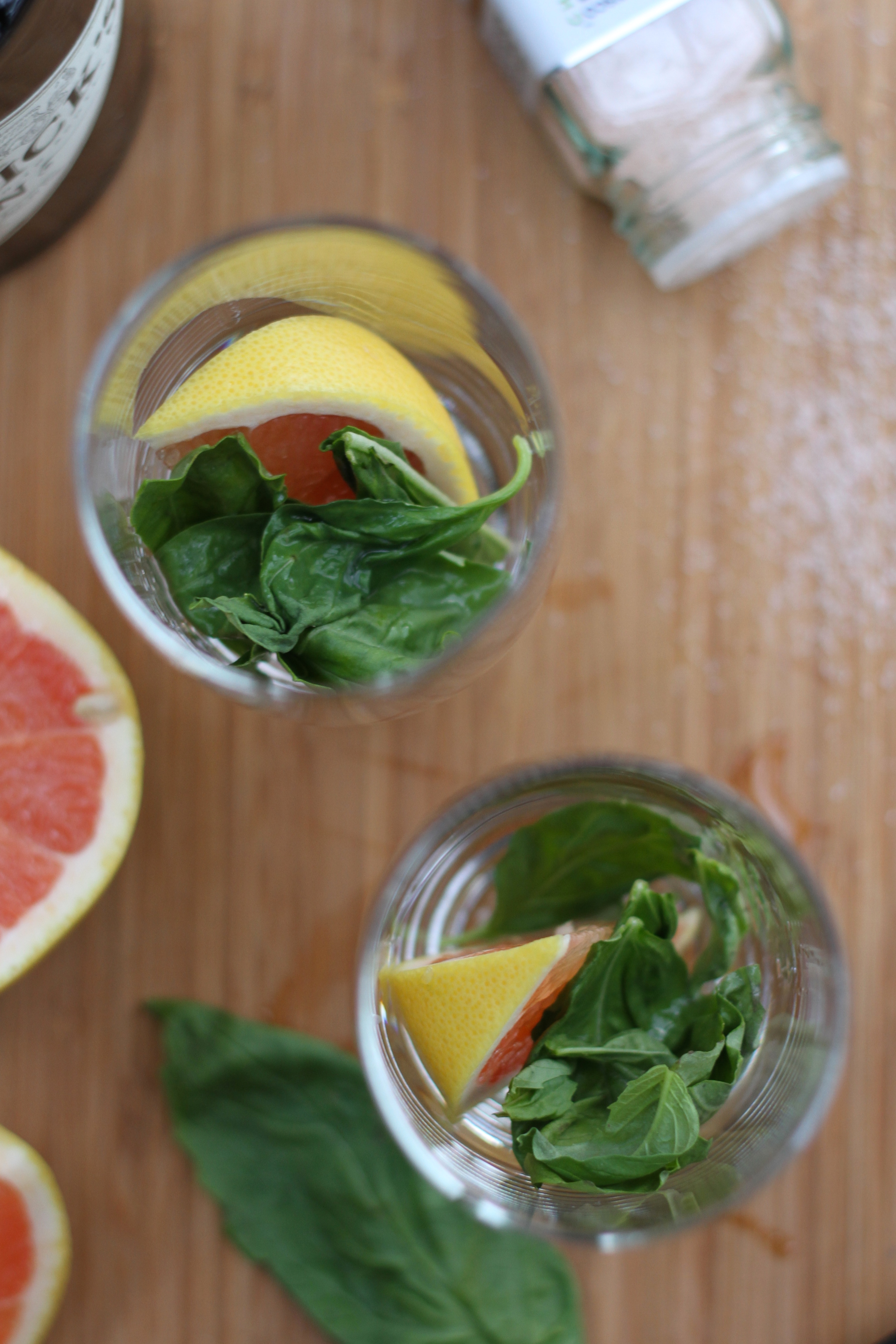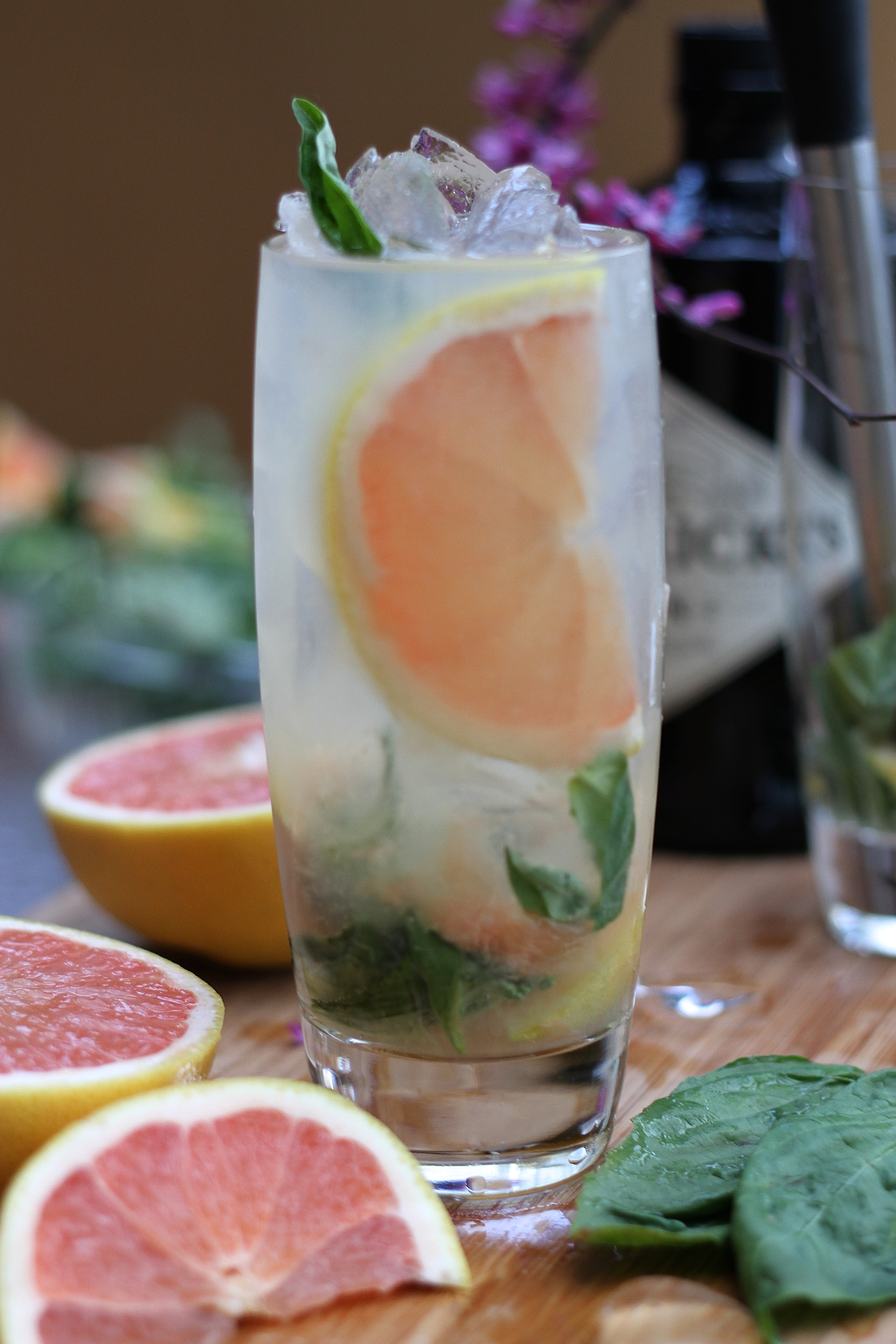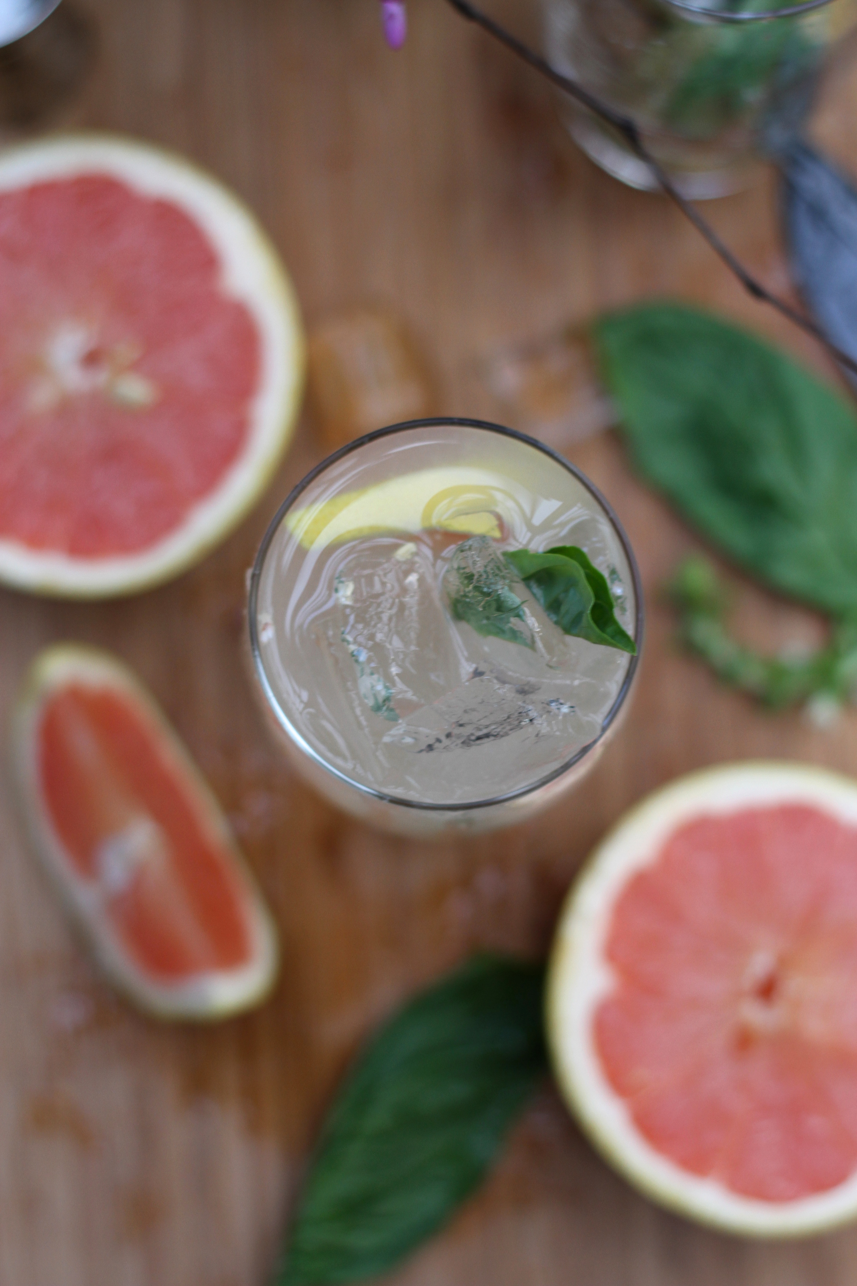 - Muddle grapefruit wedge and basil leaves gently with a splash of gin (avoiding the pith/rind as much as possible).