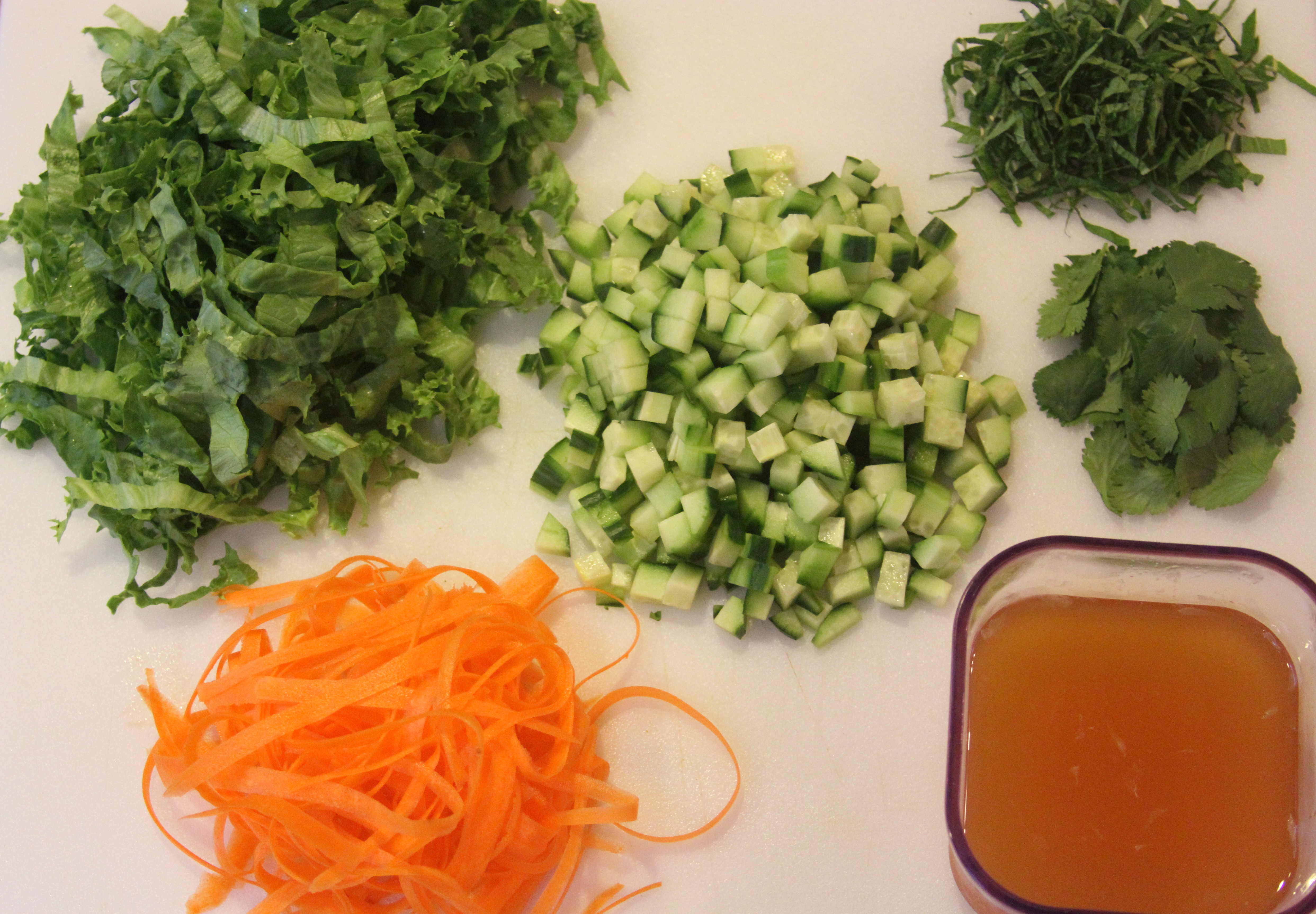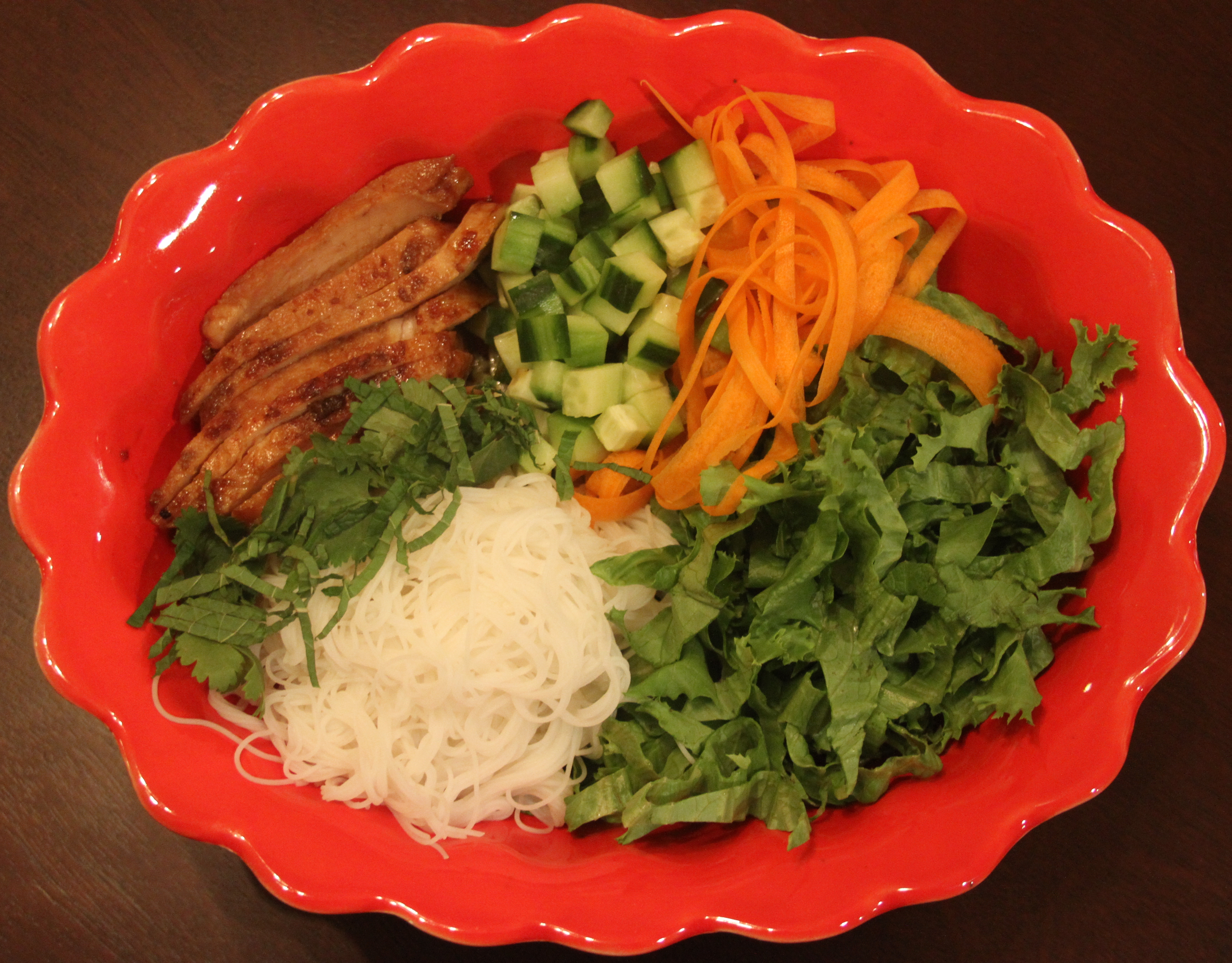 You can make the dressing and marinade the night before/morning of, and can also prep the veggies before if you’d like.  Then there is no need to worry if it’s another late night at work, because all you will need to do is throw the rice noodles in a pot of hot water for 5 minutes, grill the pork chops, and plate the veggies! Voila!